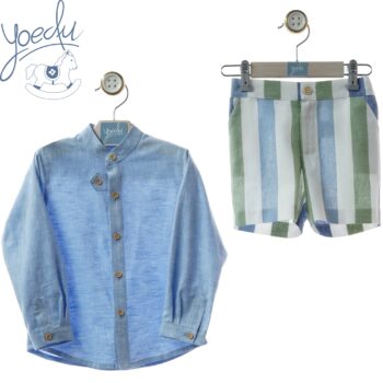 Conjunto de camisa en azul regata y bermuda a rayas combinada con color hierba