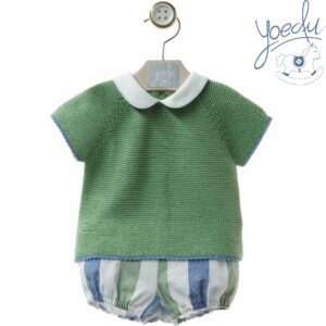 Conjunto de ranita en tonos verdes y azules, al tono del jersey