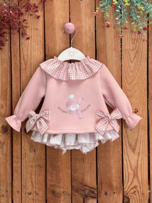 Conjunto sudadera en rosa maquillaje con detalles invernales y ranita al tono, cuello y lazos vichy