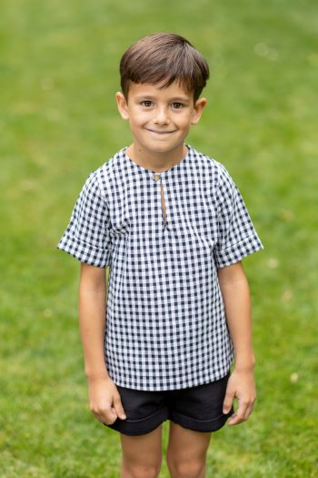 Conjunto de camisa manga corta en vichy negro con detalle en cuello y pantalón corto al tono