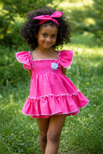 Jesusito fuxia con detalles en celeste de corte evasé y fruncido en el pecho